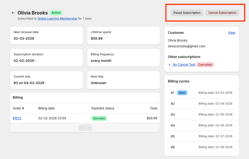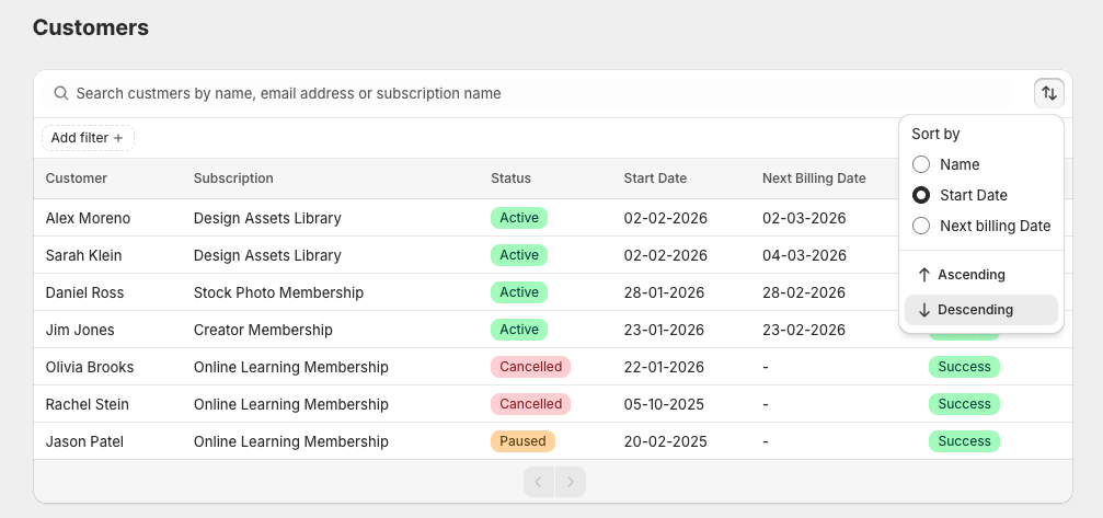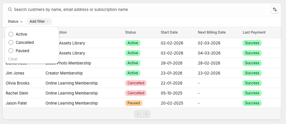 Here you’ll see a list of all customers who have an active, paused, or cancelled subscription.