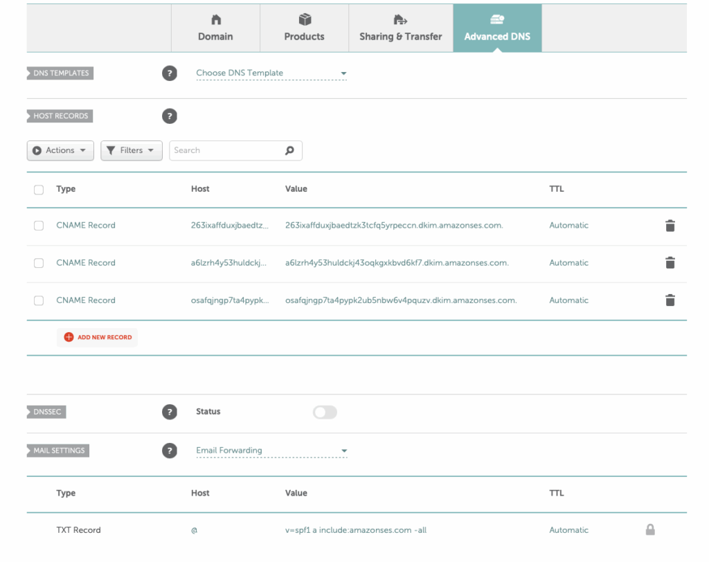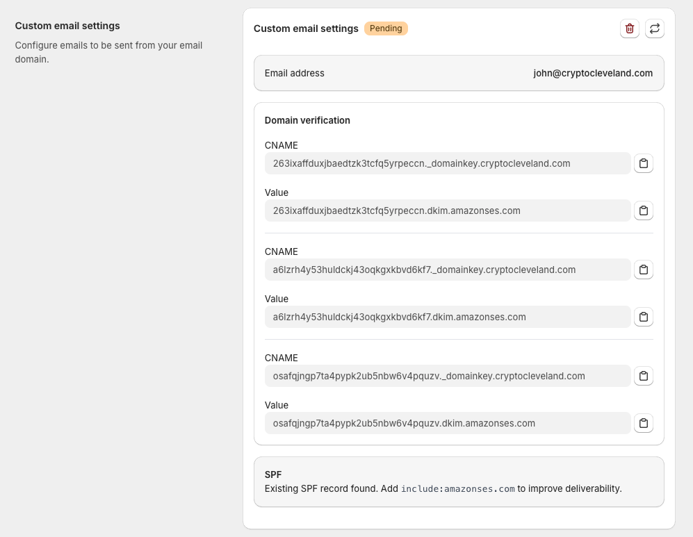After saving, we’ll generate DNS records you must add to your domain provider to verify ownership and authorize email sending.