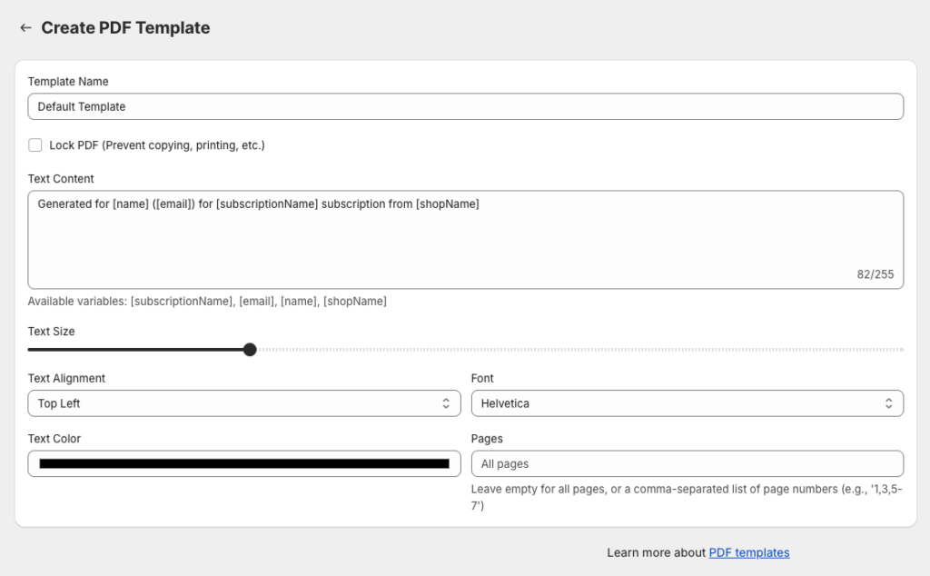 - Enter the content you want stamped on the PDF. – You can mix static text and dynamic variables (see below).