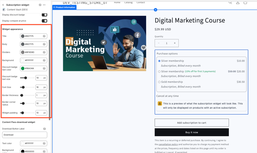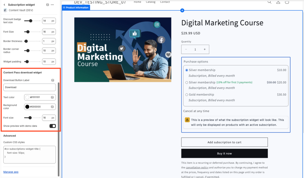 If you’re using Content Pass, you can customize the subscriber download button: