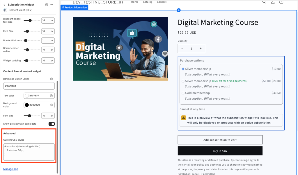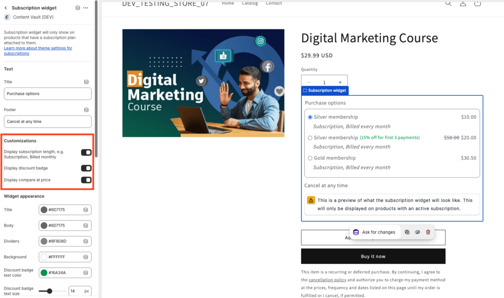 - The widget only appears on products with an active subscription attached