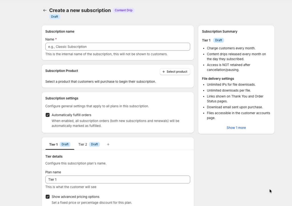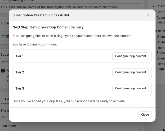 A Content Drip Subscription lets you deliver digital content to customers over time while Content Vault automatically handles subscription billing, access control, and file delivery.