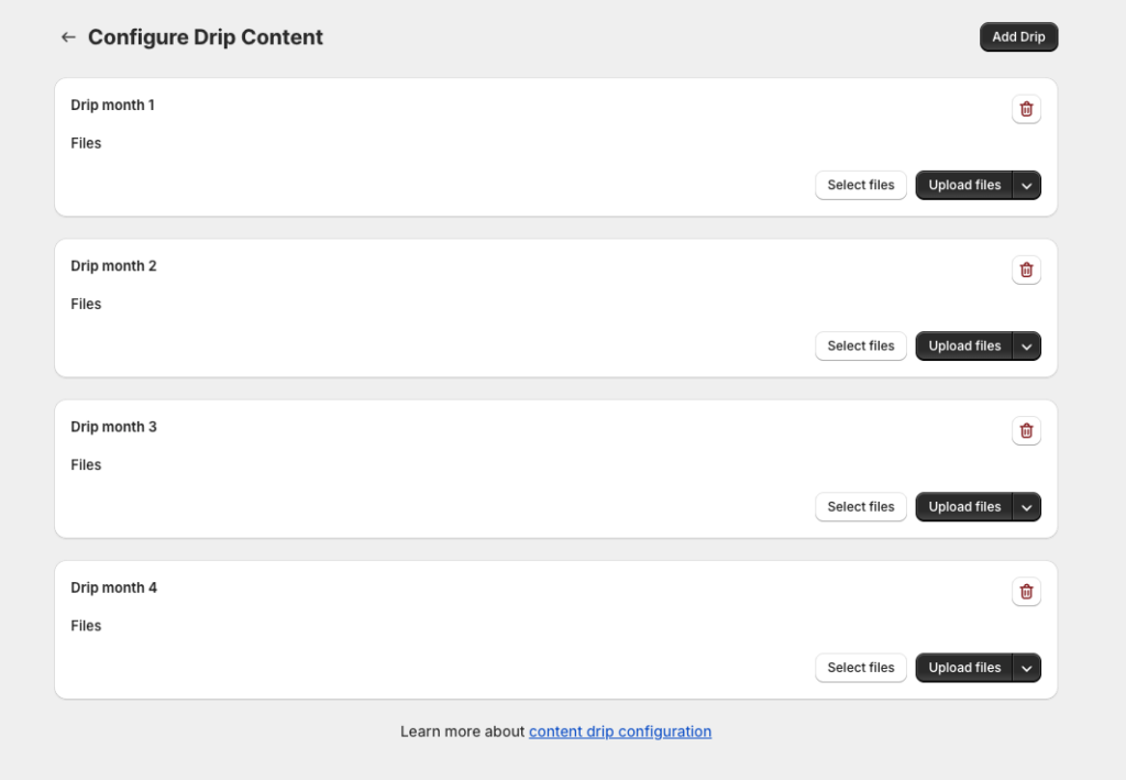 After saving, you’ll see a list of tiers with a Configure drip content button.