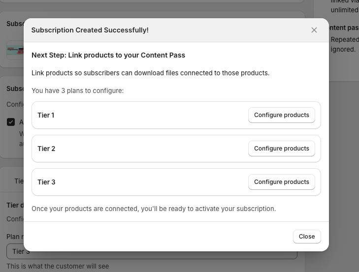 After saving, you’ll see a confirmation modal prompting you to finish setup for each tier.
