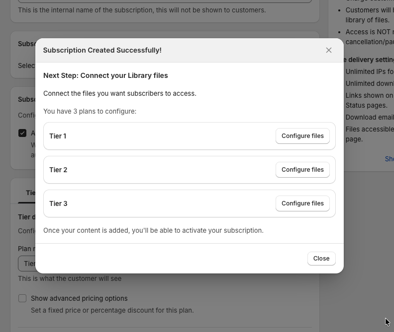 After saving, you’ll see a confirmation modal prompting you to connect files for each tier.