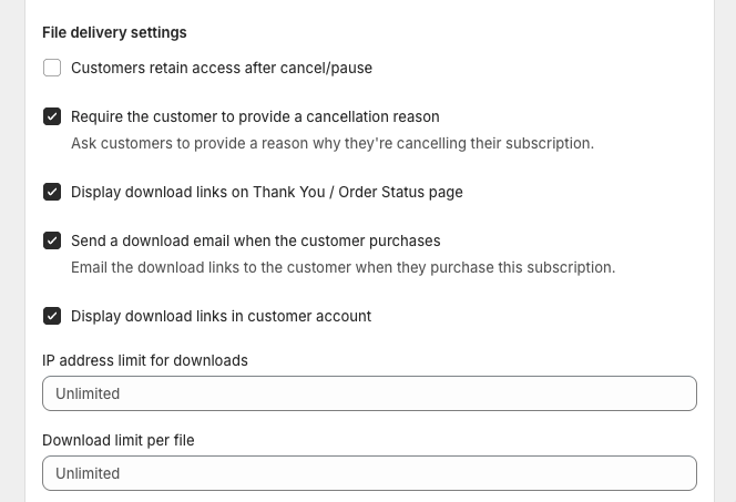 A Library Access Subscription gives customers access to a library of digital files based on the access rules you configure. Access can be limited to an active subscription or retained after cancellation, depending on your settings.