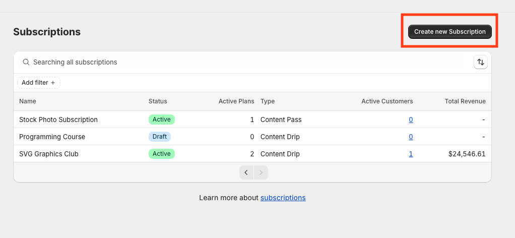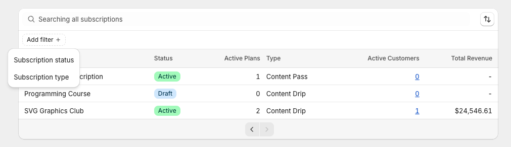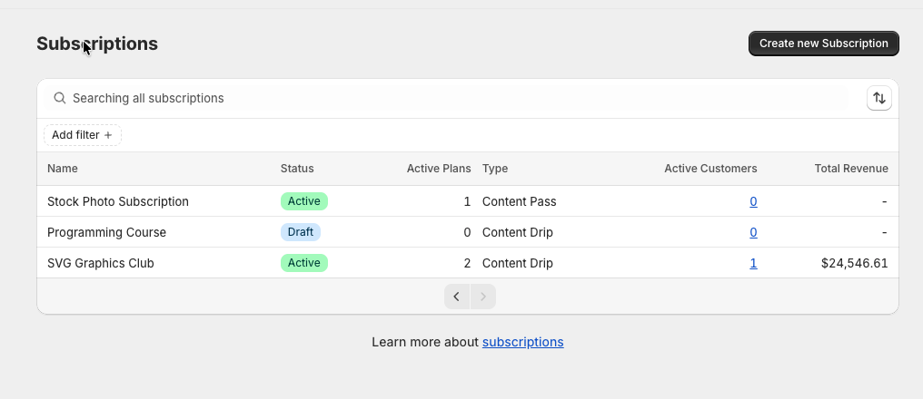 Each row in the table represents a single subscription you’ve created (Content Drip, Content Pass, or Library Access).
