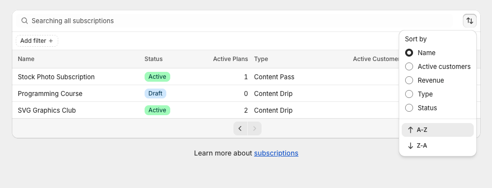 You can sort subscriptions using the sort menu in the top-right of the table. Available sort options include: